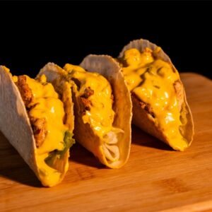 Three crispy hard shell corn tacos filled with seasoned minced beef, fresh lettuce, cheddar cheese with a savory base of pico de gallo, guacamole, and sour cream.